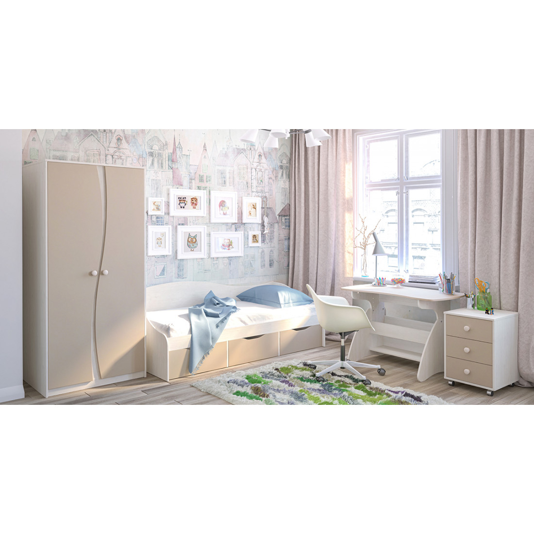 Детский двухстворчатый распашной шкаф для одежды со штангой МН-211-16 серии Комби от Мебель-Неман обладает достаточной вместительностью для размещения одежды на плечиках двух детей. Оригинальности модели добавляет эффектное сочетание светлого дерева и нежного лайма и волнообразная форма двух сходящихся вместе створок. Купить плательный недорогой шкаф для детской можно отдельно или в комплекте с другими модулями Комби.