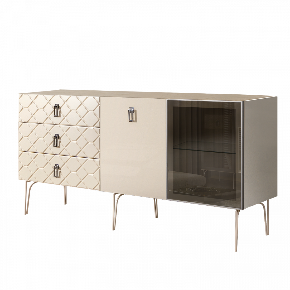 Стекло Stopsol меняет свои отражающие свойства под воздействием источников света. Поверхность, отражающая свет, мягко скроет содержимое вашего комода или витрины.