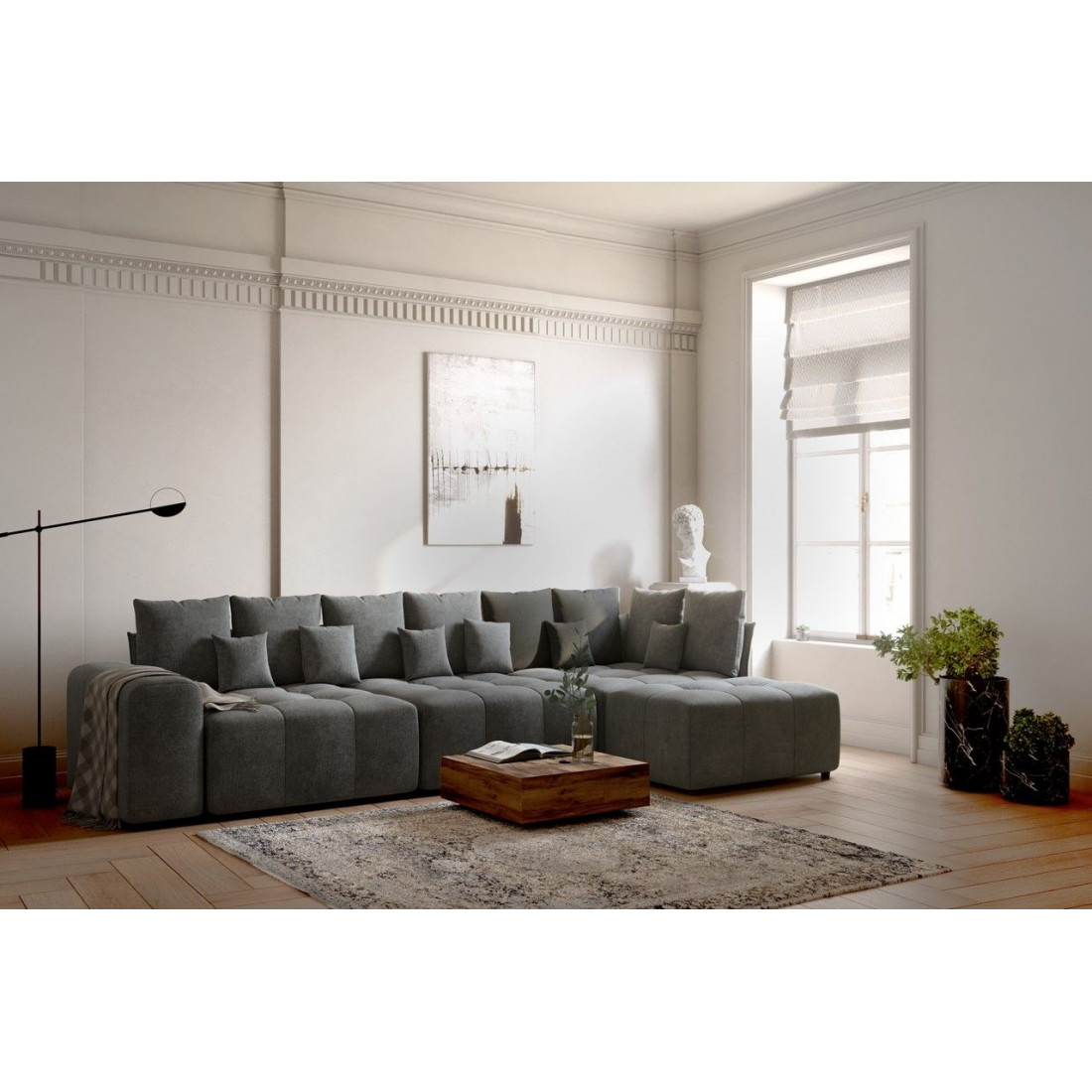 Модульный диван «Торонто» — это отличный вариант для тех, кому сложно подобрать монолитную конструкцию из-за сложной конфигурации помещения, а также тех, кто любит экспериментировать и часто делает перестановку. С его помощью можно легко изменить интерьер, превратив часть конструкции в пуф, кресло или софу.