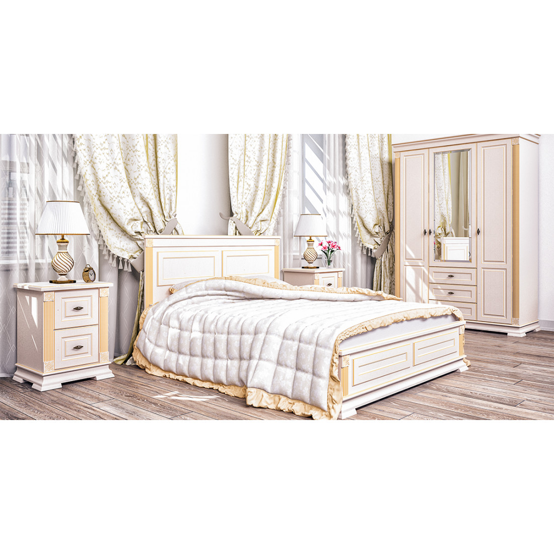 Роскошный четырехстворчатый шкаф для одежды и белья МН-222-14 в спальню новой серии Афина (Мебель-Неман) выполнен в светлом кремовом оттенке с золотой патиной, является настоящим подарком производителя. Купить шкаф можно для комплекта полного спального гарнитура Афина с другими элементами серии или отдельно.