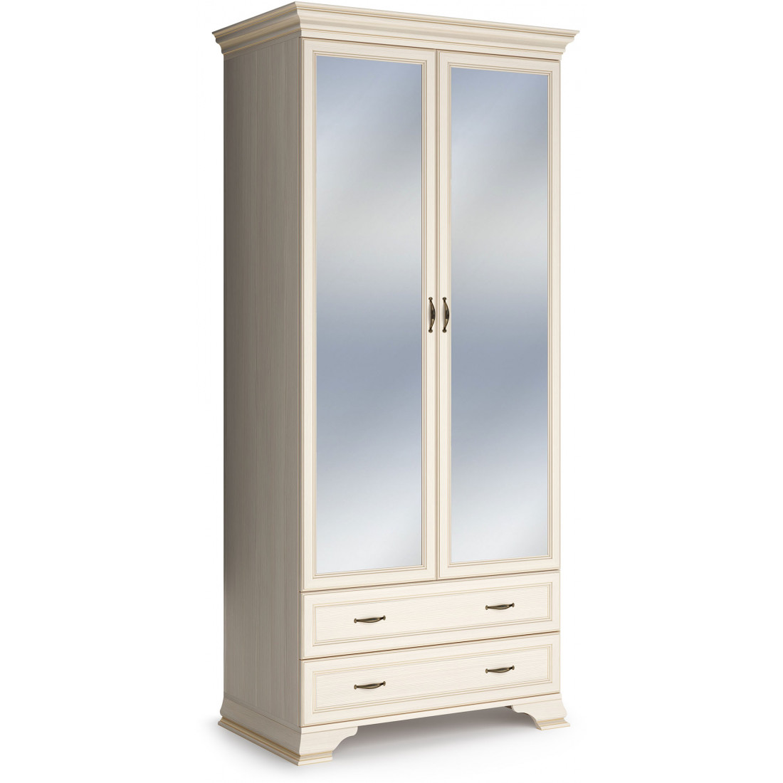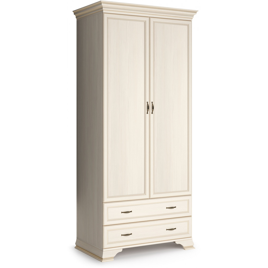 Для Шкафа применяется ЛДСП и МДФ в цвете «бодега белый» с эффектом патинирования золотом. Облик дополняют рамочные фасады и карниз в классическом стиле, а также эффектные опоры из МДФ.